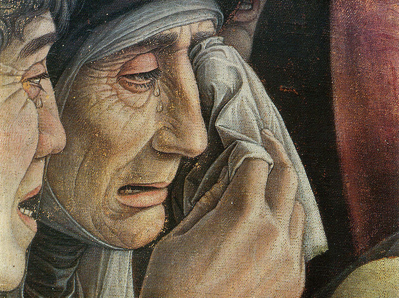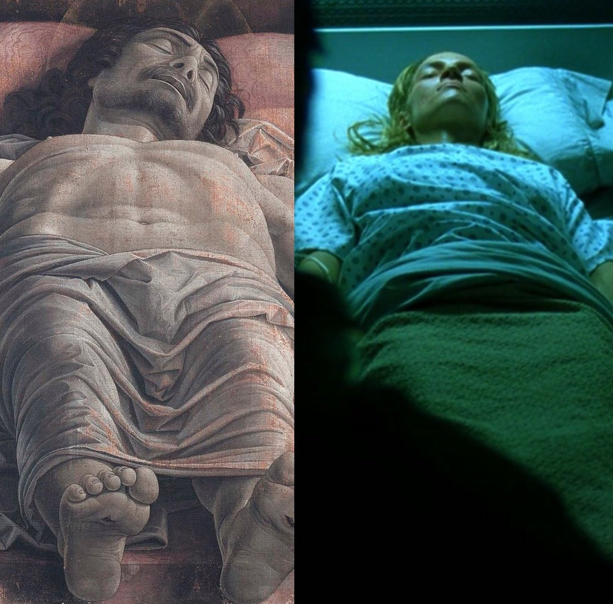 在曼坦尼亚的《哀悼基督》中,人们看到的是一个正面平躺与画面垂直,双脚面向画面的基督。基督的尸体占据画面的主体,用手帕拭泪的悲伤圣母被压缩在画面左上角。