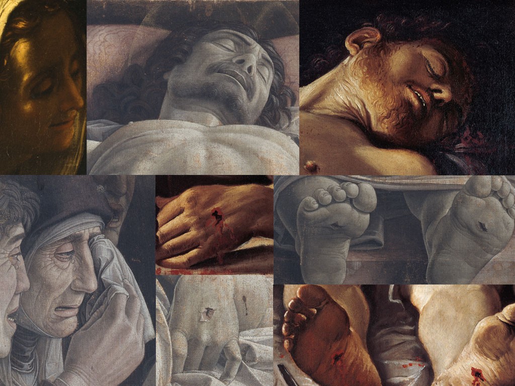 曼坦尼亚擅长使用正面透视的画法,以营造现场感。他有意通过悲伤的的视线让观者关注到基督的痛苦,还有双手双脚上被钉过的洞。
