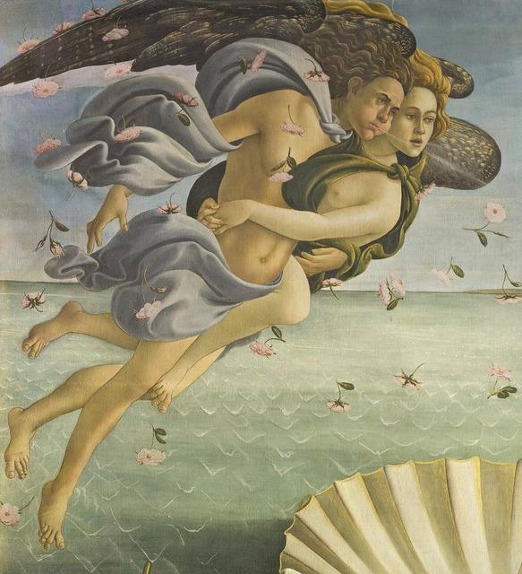 西风之神和花神克洛莉丝腰缠臀绕,宛若一对连体人在天地间飞翔,西风之神血气方刚,腮部鼓起,正劲吹不止。美丽的克洛莉丝则轻吐温馨之气,将维纳斯送到岸边。