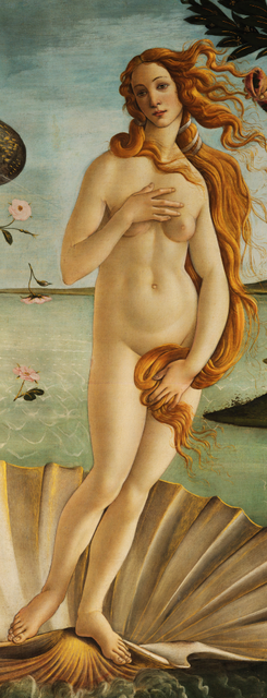 波提切利描绘了维纳斯将动未动的一瞬,复杂而美丽的形体扭转,预示着她即将走下那个巨大的金色扇贝,来到海岸上。维纳斯是在提坦众巨神之一克洛诺斯阉割他的父亲,天神乌拉诺斯时,后者被割下的生殖器掉进大海后受胎而生的。