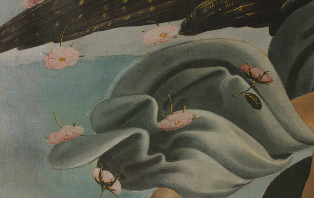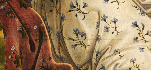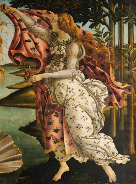 时间女神是维纳斯的侍女,无论是她华美的长裙,还是她向维纳斯送过去的绚丽的长袍,都绣着红色、白色的雏菊,黄色的报春花和蓝色的矢车菊,这些都是春天盛开的花与“诞生”的主题十分相宜。她脖子上戴着用爱神木枝叶编的花环,腰系粉红色玫瑰。