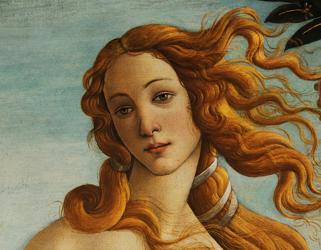 这是维纳斯女神诞生的那一刻——她站在贝壳上,在风神的吹拂下驶向岸边,时间女神拿着披风去迎接她,如大理石般滑嫩的肌肤与充满金属光泽的长发令她显得格外动人与神圣。