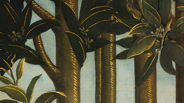 这几株树是花满枝头的橘林的一部分——与古希腊神话中赫斯珀里得斯看守的金苹果园相呼应。每一朵小白花上都带了一点金,每一片深绿色的树叶都描有金色的叶脉和轮廓,树干上亦有一条条短小的金色斜线,使其更为醒目。