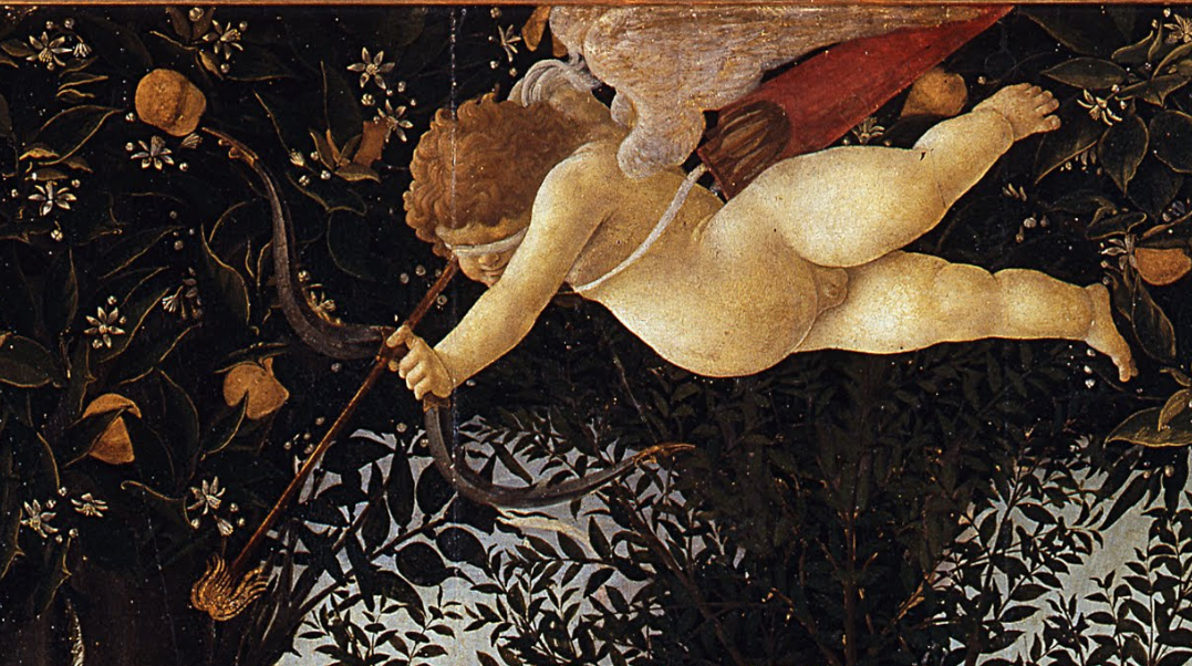 在维纳斯上方,呈拱形的橘树是她权威的一个象征。她的儿子丘比特蒙着双眼,正将一支燃烧着的箭射向美惠三女神。丘比特,在文艺复兴时期绘画中的丘比特常常被蒙上眼睛,表示“爱是盲目的”这一谚语。