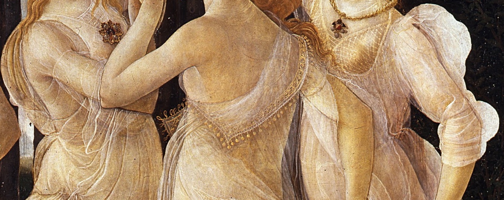 美惠三女神正优雅地围成一小圈跳着舞,透明的服饰完全掩盖不住她们曼妙的裸体,她们所佩戴的珠宝是美第奇家族的颜色。最右边的名叫“华美”,中间的名叫“贞淑”,左边的名叫“欢悦”。