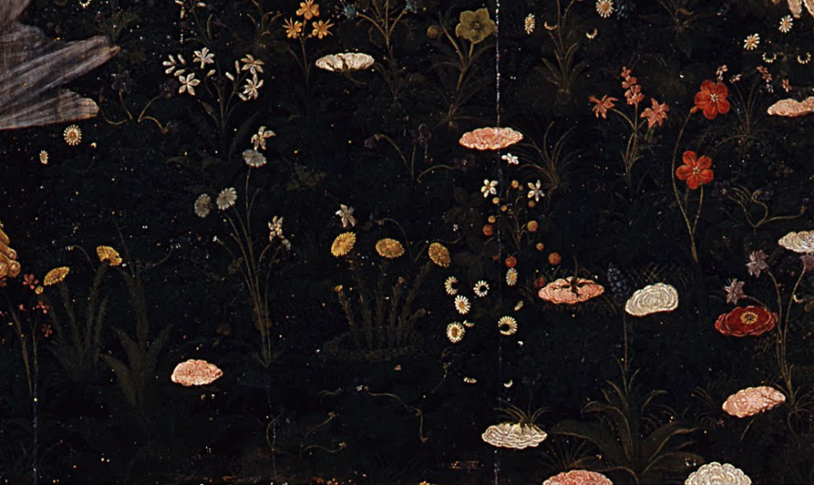 波提切利的春之花园里,百花盛开,他仔细描绘了约五十种鲜花:夏天盛开的玫瑰、初冬开放的款冬,车前草、风信子、鸢尾、雏菊......,波提切利并不局限于春季特有的花卉,在他塑造的春之花园里,四季的花卉都可以同时绽放,四处皆生机勃勃。