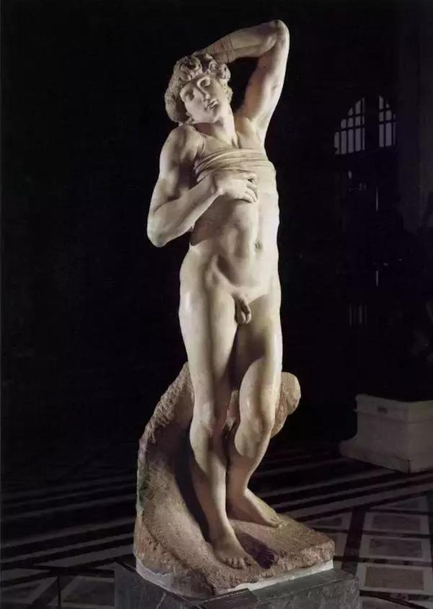 1513-1516年,米开朗基罗为教皇陵墓,也为自己创作了现今名为“奴隶”系列的雕塑作品。《垂死的奴隶》是米开朗基罗完成的一尊充满成熟魅力的雕塑作品。画面中的青年面容俊美,比例匀称。