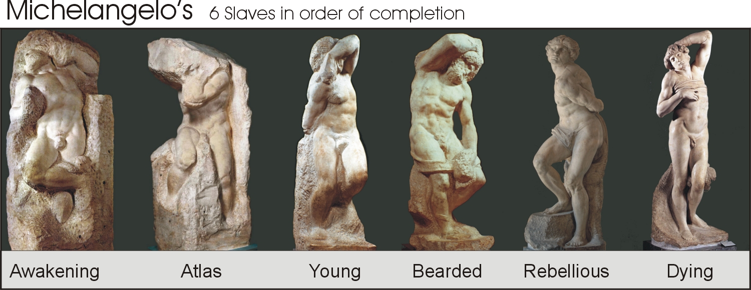 米开朗基罗以写实的手法将奴隶的形体塑造得生活而具有活力;