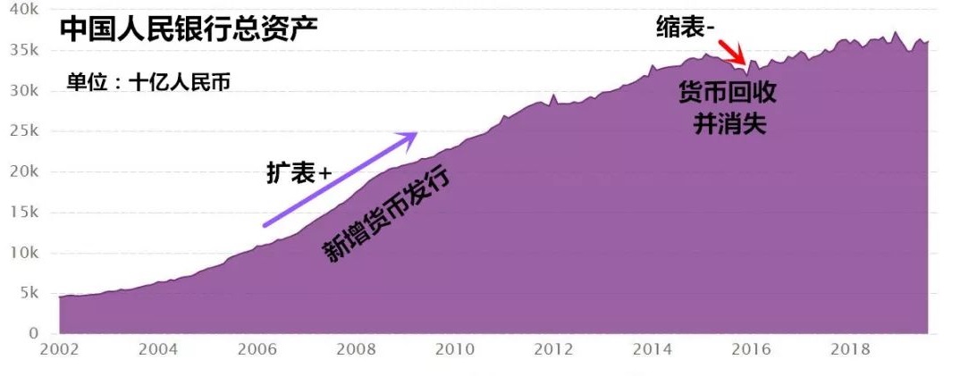 从长期趋势上看,人民银行资产负债表是不断扩张的(不断扩表),即不断有新增的货币发行。每当出现货币回收时(收回即消失),资产负债表就会“缩表”,而人民银行为了不影响实体经济运行,又会快速通过某种途径新增货币发行,来对冲掉“消失的货币”,以增量对冲减量,以扩表对冲缩表,正因如此,资产负债表才会呈现长期扩张趋势。