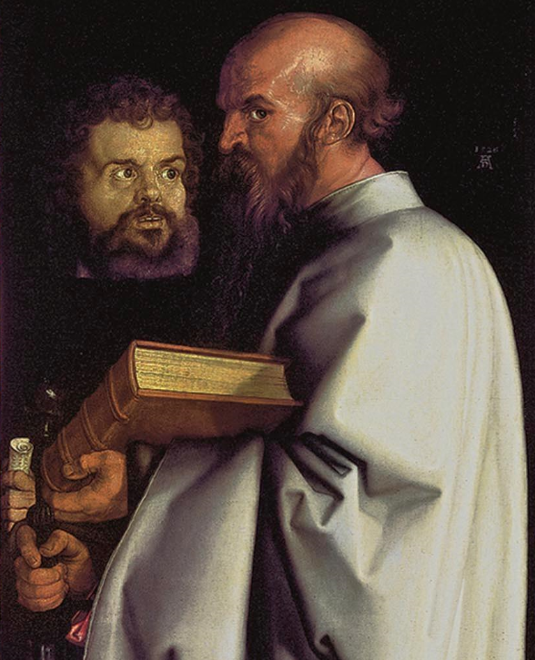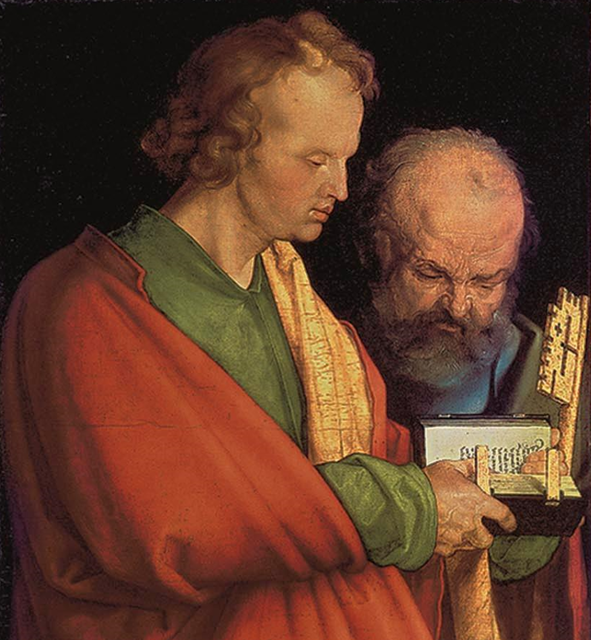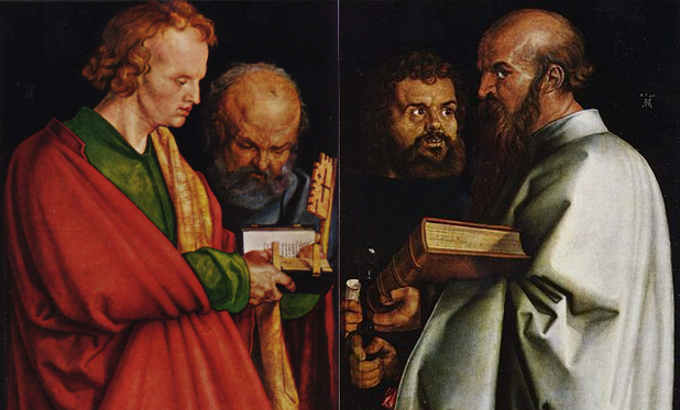 《四使徒》是丢勒晚年的油画作品,被认为是他一生探索的总结。丢勒在画中不仅表现了古典主义艺术的自然之美,也保留了北方哥特传统那种简洁而肃穆的精神内涵,被视为其故乡纽伦堡市的精神象征。