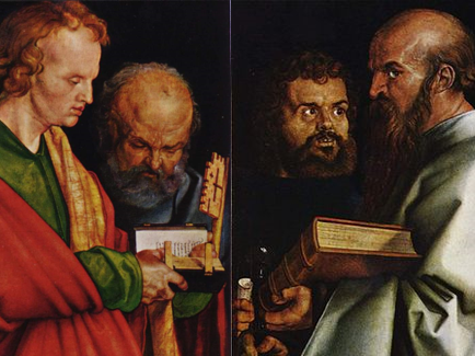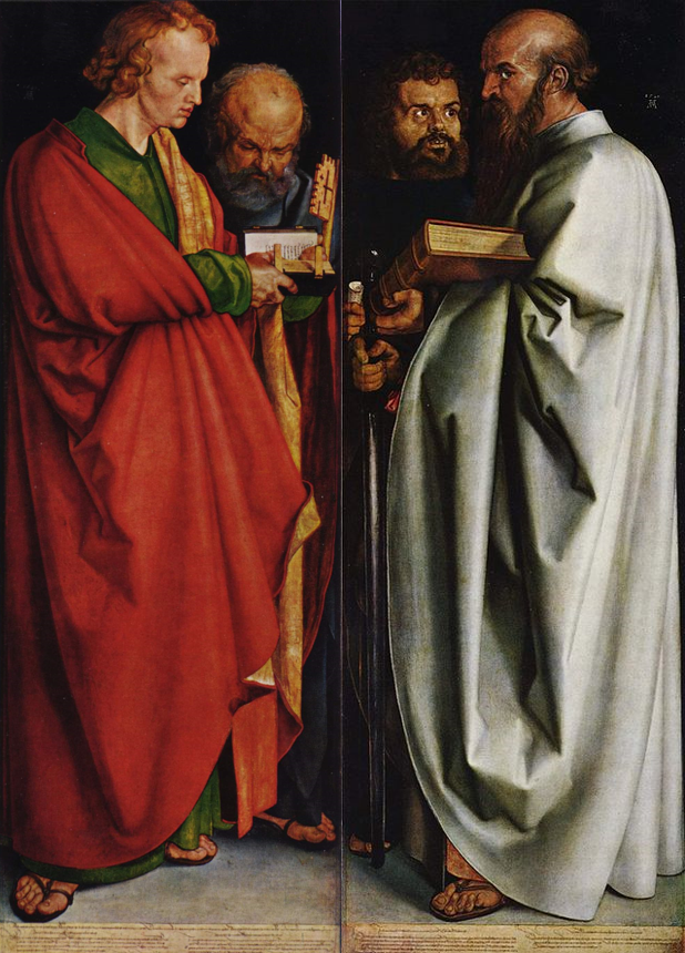丢勒通过人物的站位表达了对路德教派的倾向。他将路德所偏爱的圣约翰和圣保罗安排在前景相对而立,两人占据了画面大部分面积。圣彼得和圣马可分别站在他们身后。