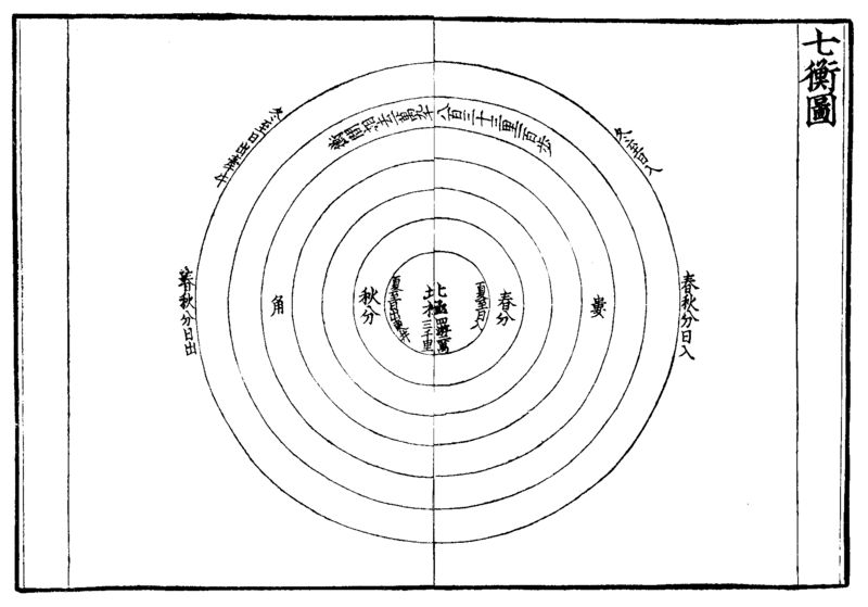 规矩体现着阴阳,那么以此决定的建筑法式也就必然具有阴阳两种。《周髀算经》卷上同时载有一幅“七衡六间图”,七衡的比例呈等差之量。很明显,如果周髀圆方与方圆二图合之构成等比之法,那么其与“七衡六间图”所呈现的等差之量就形成了中国传统建筑的两种法式,这两种法式作为中国古代建筑之标准法式完美地体现着阴阳的思想,其中等比之差为阳,等差之均为阴。发现于陕西西安的唐代圜丘遗址呈四层圆坛结构,内三圆等比为阳,外三圆等差为阴,综合阴阳两种法式于一体,巧妙地表现了天垂象以生万物的阴阳观念。