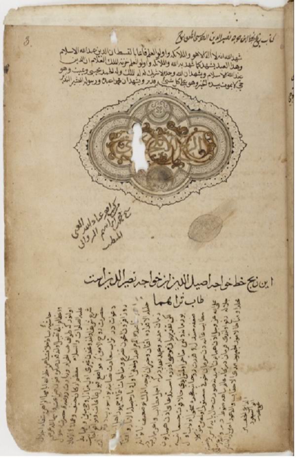 兰普尔-礼萨图书馆所藏《伊利汗积尺真理昭微》抄本前有内沙布里亲笔书写的题记。根据题记内容,我们可知此书初稿完成于1308/09年,而该抄本则是作者于1310年4月亲自抄写并题献给宰相撒瓦只的。据信,该抄本中所有的表格和插图应该也属作者亲笔。