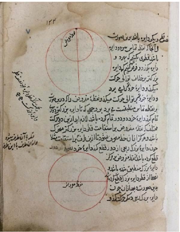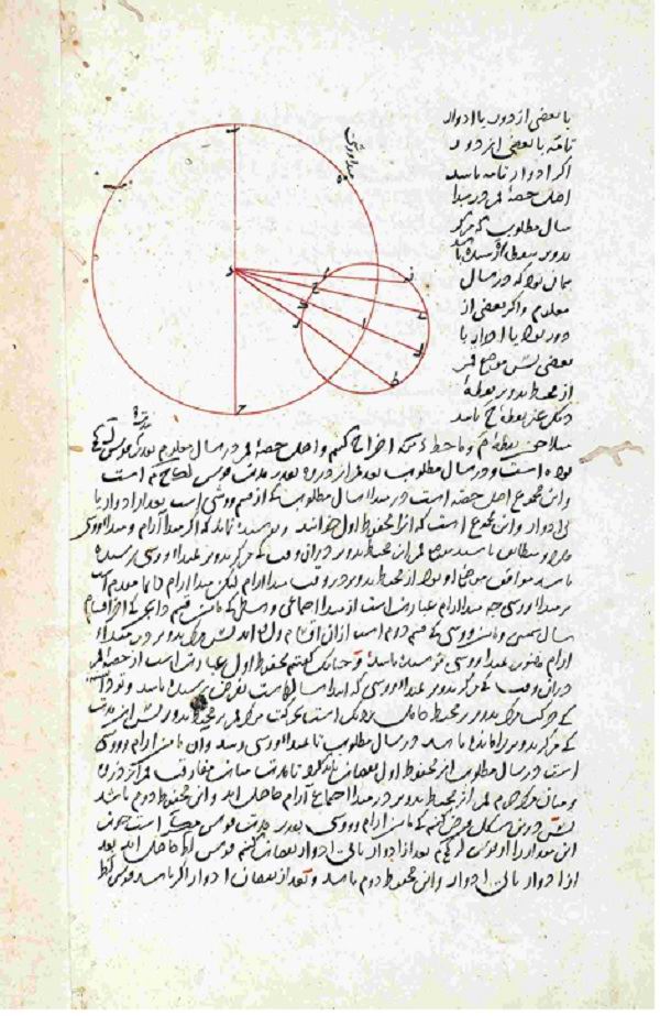 《伊利汗积尺真理昭微》第一章第七节中内沙布里用图表而非代数的方法对中国历法进行解释。尽管纳西儿丁·图昔曾经设计了一个“图西双本轮模型”(Tusi Couple)来解释中国历法的运算体系,但内沙布里更进一步将各个历法节点整合到一个本轮图(epicycle)模型(即一大一小两个重叠的圆形)中,并尝试在本轮图上用点、线组合来标识中国历法中的不同节气及其运行机理。例如图表中的L点,就表示满月点,即月球距离地球最远的时候。就我所知,这也是伊斯兰世界第一次将中国的历法系统转换成在伊斯兰知识系统中更流行的托勒密系统——也就是几何学模型上。