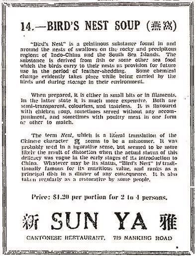 在食用方式上,燕窝延续了传统的烹饪方式,即从泡发到蒸煮调味的一系列程序,也增加了新的消费形式。随着新式餐厅的出现,燕窝餐成为新的卖点,更被列入来华西人意欲品尝的中国菜清单。最大的“创新”当属燕窝糖精,事实上燕窝糖精并不含燕窝,亦不具备滋补或治病作用,其在晚清的“发明”,背后折射出假药及其广告对人们的滋补意识和身体观念所产生的重大影响,进而影响了近代中国的消费文化、身体文化之建构(张仲民《当糖精变为燕窝——孙镜湖与近代上海的医药文化广告》,《社会科学研究》2017年第1期)。尽管如此,近代社会对真燕窝的消费始终热情不减,即便在燕窝被证明“无甚价值”之后,其作为上流社会奢侈品的地位并未消退,背后蕴含的是社会文化对真燕窝效用的认知,以及滋补的医学观念在数百年间对燕窝消费文化土壤的根植。