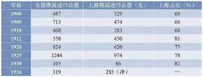 每年从南洋各地输入中国的燕窝量,在各国出口燕窝中占据首位。20世纪20年代初,燕窝输入中国内地需要由新加坡到香港再到上海数次转运,到了30年代,中国内地可直接从香港地区、越南、爪哇、台湾地区、澳门地区、新加坡、印度等多地进口燕窝。上海则是中国各地的燕窝采购中心,20世纪上半叶,由上海输入的燕窝总值通常占到全国进口燕窝总值的一半以上。据1930年《上海指南》,上海的参燕铺有三十余家,大多集中在南市咸瓜街一带(今中山南二路附近),这里是当时沪上海货集贸市场。