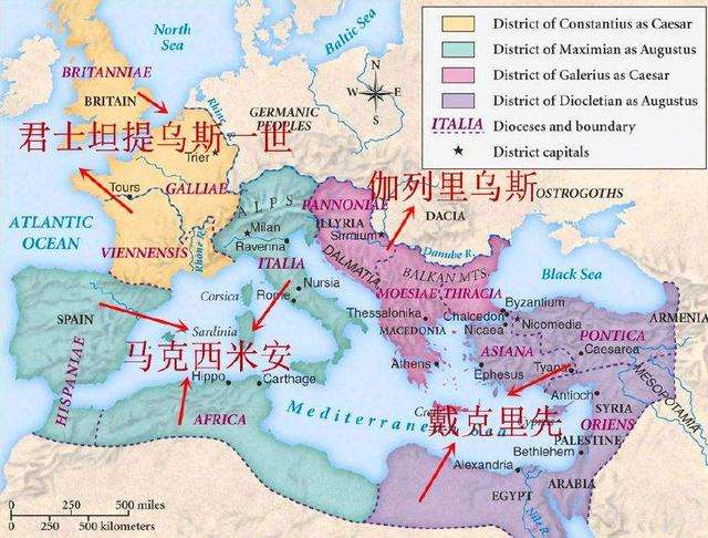到了戴克里先时期,沿用这两个称号,两个正皇帝叫奥古斯都,两个副皇帝叫凯撒。四帝共治的效果还挺好,原本动乱的边疆被迅速镇压,国内安定了一段时间,罗马再次强盛起来。