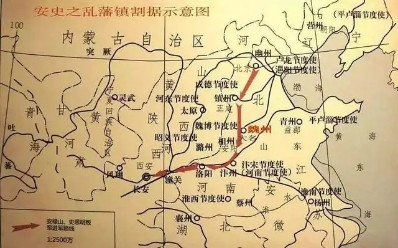 唐朝中后期节度使分布图,红线为安禄山起兵路线。