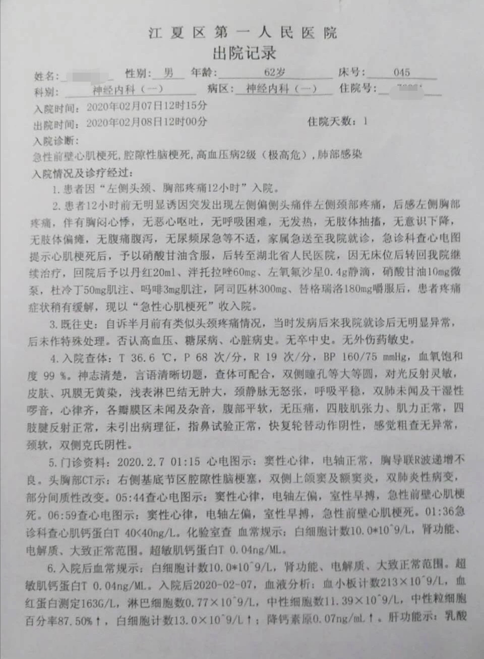 2月6日晚间,肖林的姑父突发疾病,送到武汉协和江南医院后确诊为心梗,随后以无法医治为由要求姑父转到湖北省人民医院,但湖北省人民医院因发热病人太多无法接收,随后又在三家医院奔波,均不被收治。