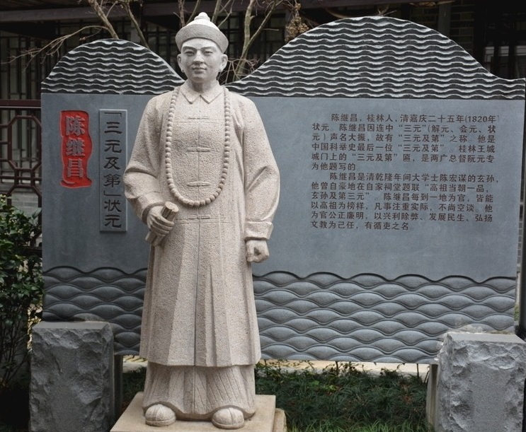 清人王之春(字爵棠, 又作芍棠, 湖南衡阳人, 明代大学者王船山七世孙)撰《椒生随笔》载:古今连中三元者, 仅唐朝张又新、崔元翰,宋朝孙何、王曾、宋痒、杨置、王岩叟、冯京,元朝王宗哲,明朝商辂,清朝的钱檠(或为棨)、陈继昌等十二人。 其中广西籍两人, 即宋朝的冯京和清朝的陈继昌。
