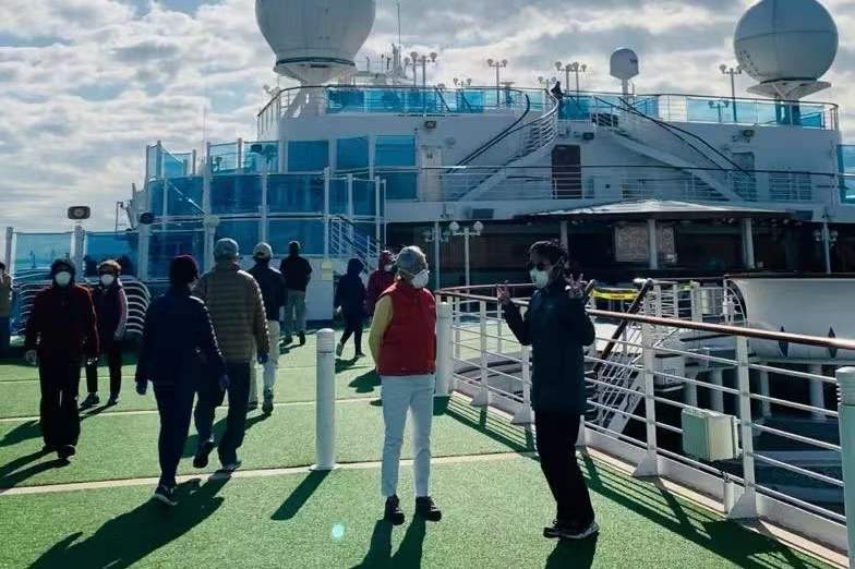 他们已经在海上被隔离了14天,重新踏上陆地的感觉久违得美好。连当天上午的甲板“放风”时刻,对这名香港游客来说也变得珍贵,“这是我们离开前的最后一个甲板时刻,而这将成为历史。”她说。