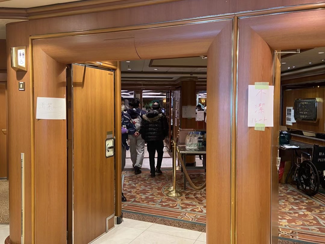 日本厚生劳动省副大臣橋本岳曾在Twiiter上发布了一张照片,图中显示了钻石公主号的隔离措施:在通往同一室内空间的邻近两扇大门上,分别贴着日语“清洁之路”与“不洁之路”。后来这篇推文被删除。
