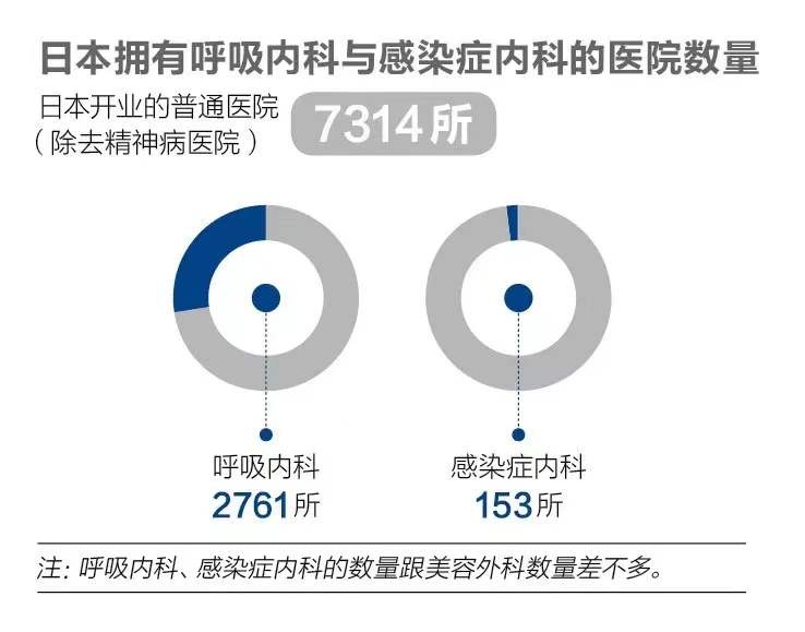 一位日本医疗系统的人士告诉记者,目前日本包含诊所在内,病床数大概在16万张左右,但专门为治疗感染症类疾病所配备的病床只有不足1900张,只占总数的0.1%,且分布在全国各地,短时间内无法立即调用。