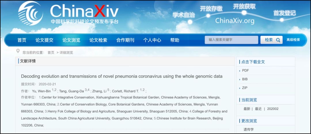 2 月 21 日,中科院西双版纳热带植物园、华南农业大学、北京脑科中心在中国科学院科技论文预发布平台ChinaXiv提交了一篇题为Decoding evolution and transmissions of novel pneumonia coronavirus using the whole genomic data的论文,通过对四大洲、12 个国家的 93 个新型冠状病毒样本的基因组数据进行解析,追溯病毒的传染源及扩散路径。