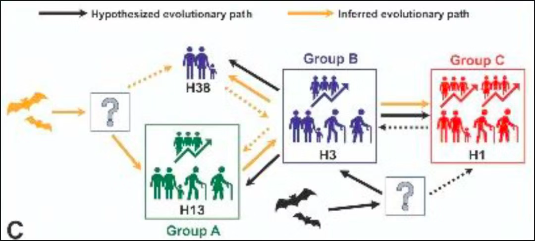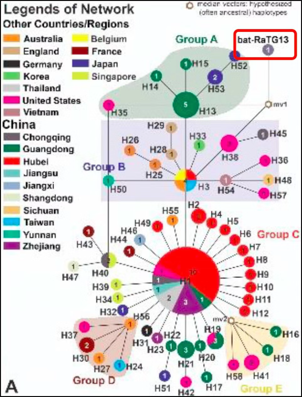 单倍型 H13 和 H38 是比较「古老的」单倍型,通过一个中间载体 mv1 与蝙蝠冠状病毒 RaTG13 关联,但是对该单倍型对应的病毒样品进行溯源,发现他们分别是来自深圳的病患(广东首例)和美国华盛顿州的病患(美国首例)。