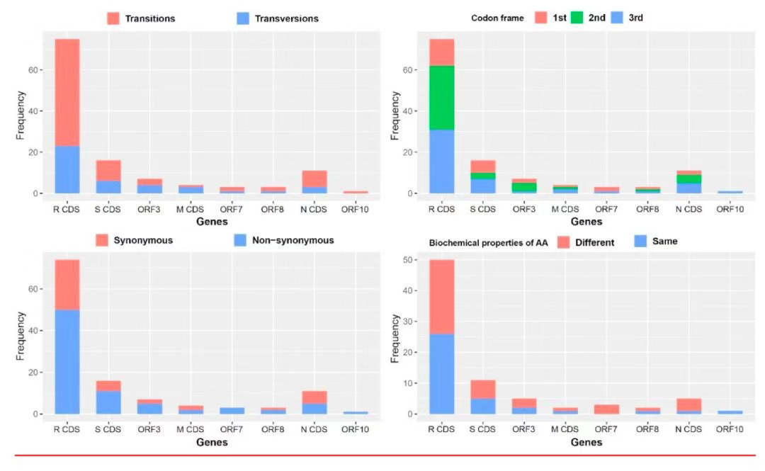 目前,研究人员还发现新型冠状病毒基因组没有发生重组事件。93 个基因组之间只有 120 核苷酸发生了突变(0.41% 序列长度),并均匀分布在 10 个编码区。120 个突变的核苷酸关联了 119 个氨基酸密码子,其中 79 个密码子 (65.83%)改变了氨基酸类型,并有 42 个(53.17%)氨基酸理化性质都被改变。