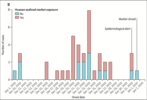 如图所示,在最初的 41 名患者当中,有 14 人并没有接触过华南海鲜市场,甚至在 12 月 1 日确诊的第一例患者也没有去过。