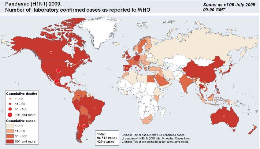 · 截至2009年7月6日的甲流疫情地图。后来由于病例报告太多,联合国一度停止接收报告