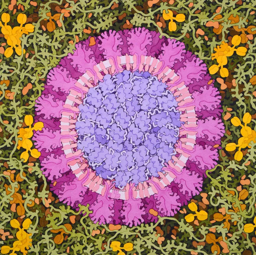这颗“心”在合成病毒所需蛋白中起到了重要作用,所以也是抗病毒药物研究的标靶。作者对本图的质感处理让它看上去也带一点手绘笔触的感觉。by David S. Goodsell, RCSB Protein Data Bank.doi:10.2210/rcsb_pdb/mom_2020_2