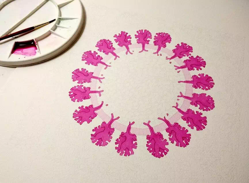 这次绘画参考的主要是SARS病毒的数据,因其信息比较完善,而新型冠状病毒与之在结构上是相似的。与我们常见的只展现单一个体的病毒画相比,他笔下的病毒或细胞时常会与周围的环境一同展示,让人看到它们在运作的某种状态。