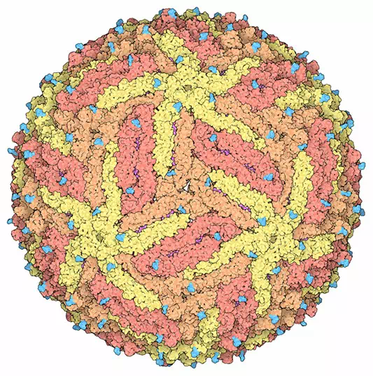 寨卡病毒的3D渲染图像。病毒有许多种几何结构,这也与研发抗病毒药物息息相关。因为了解病毒衣壳的组成模式就意味着能够知道如何在“组装”阶段就破坏它丨RCSB PDB-101