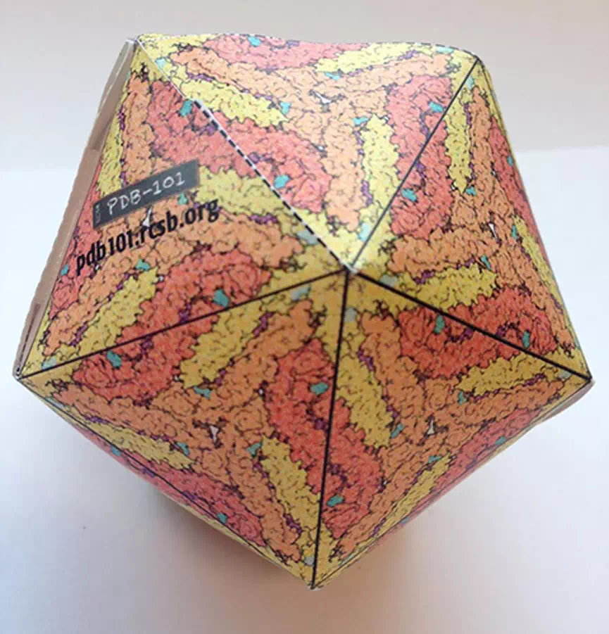 寨卡病毒的纸质模型,这样的物品在古德赛尔的工作室也有很多。可以在PDB-101官网检索并下载这些病毒展开图自己动手制作丨RCSB PDB-101