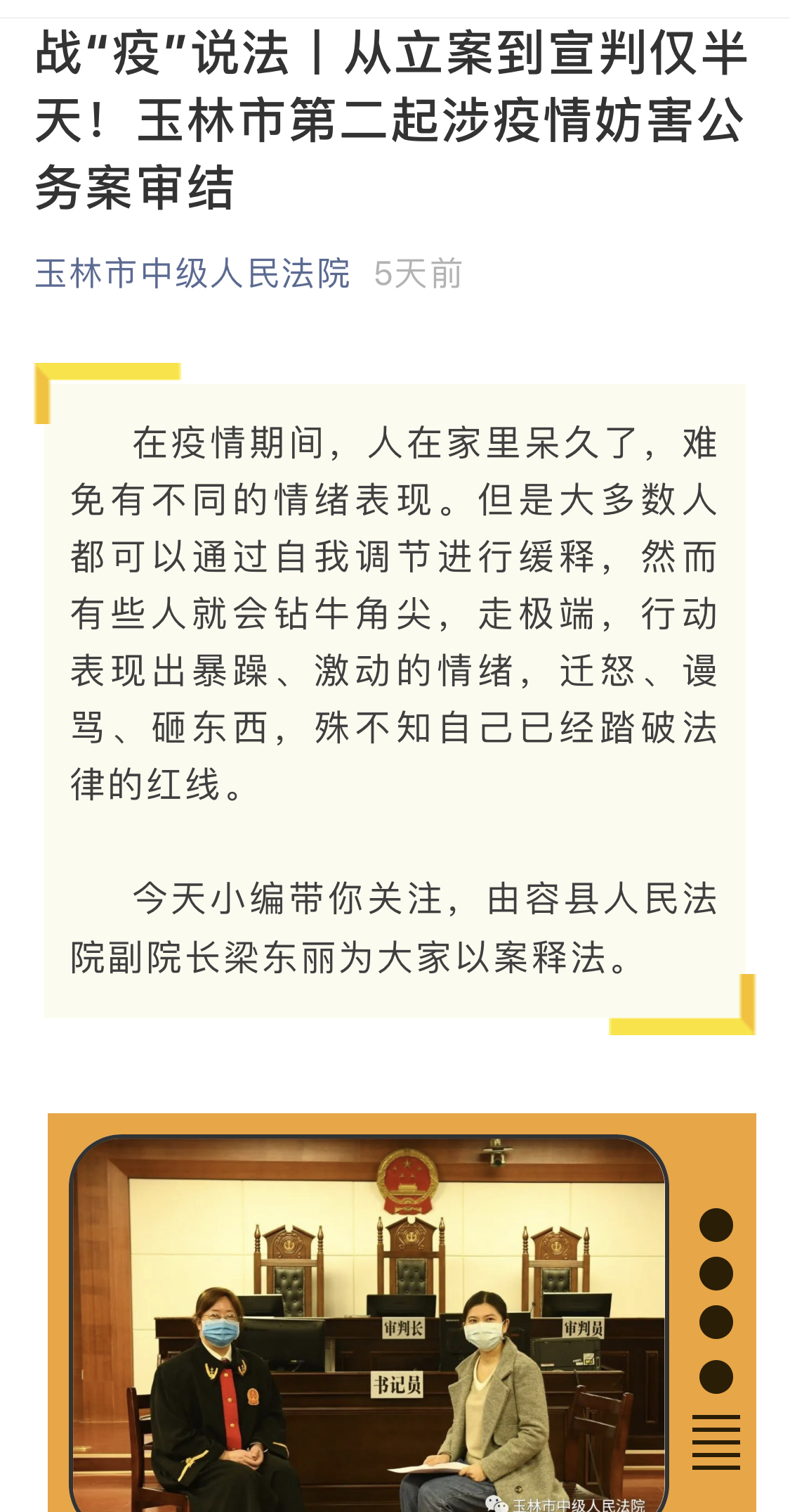 一周之后,玉林电视台报道,当地法院仅花半天时间即完成了一起妨害公务案的立案到宣判全程。2月14日,广西容县人韦某婷外出到该县黎村镇黎村圩购买生活用品,经过疫情防控监测点时,不配合疫情防控工作,暴力抗拒工作人员做登记、测量体温的工作。次日,韦某婷被刑事拘留。17日,韦某婷因涉嫌妨害公务罪批捕。18日容县检察院受理容县公安局移送的审查起诉,同日提起公诉。19日,容县法院收案、立案,当日上午韦某婷被宣布犯妨害公务罪,判处期徒刑六个月。案发到宣判,全程历时也仅5天。