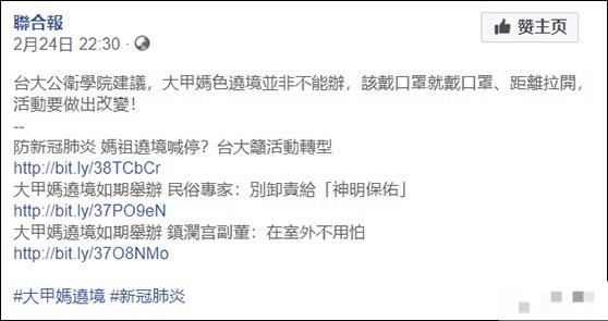若说元宵节的盐水蜂炮能顺利举办,是因那时疫情尚未蔓延。那么如今病毒已扩散,大甲妈祖绕境是否该如期举行?一时间成为社会讨论的焦点。