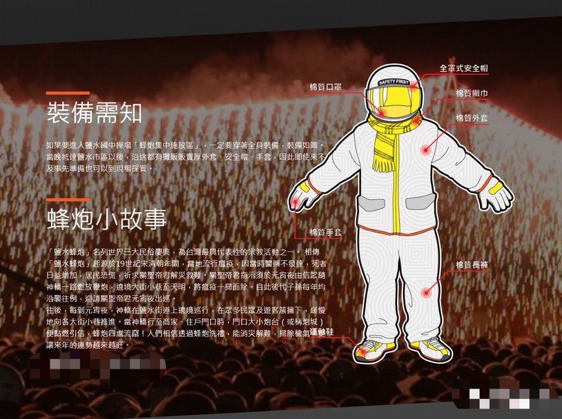 参加盐水蜂炮的民众,自是为求除病消灾,只是身处于爆竹阵中,烟火四起仿佛战场,要安全着装才能保得自己不被灼伤。
