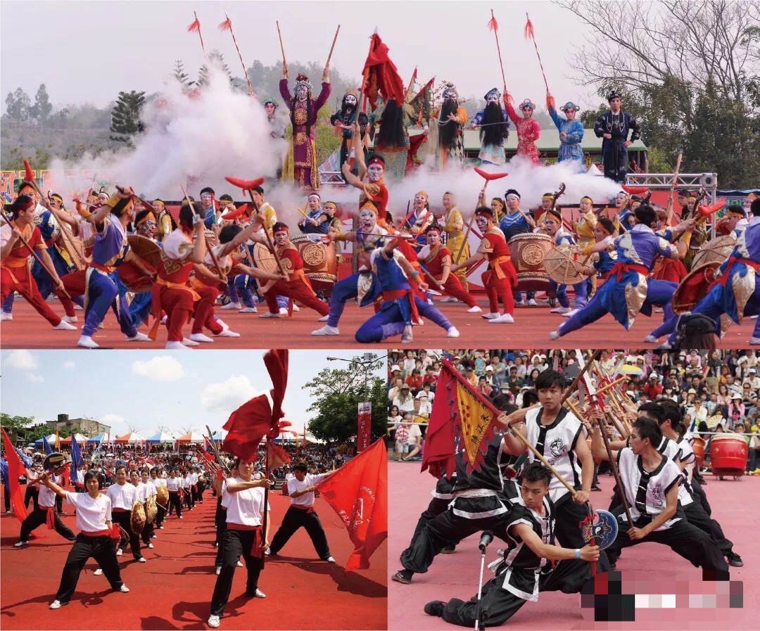 虽是佛家的诸神,却并不妨碍本地民众用自己的方式来祝赞。这种民俗被称为“阵头”,是台湾地区请神明绕境、消灾降福中很重要的大型方阵表演。阵头分文、武二式,文阵以传统歌舞为主,武阵则是以展示中华功夫为核心。