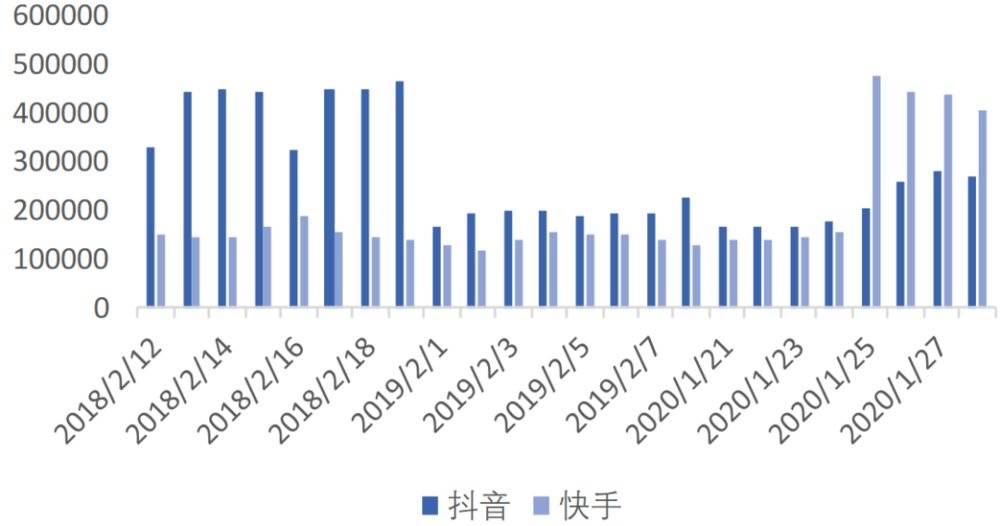 2020春节期间抖音和快手的每日下载量较2019年波动上升 数据来源:七麦数据,国泰君安证券研究