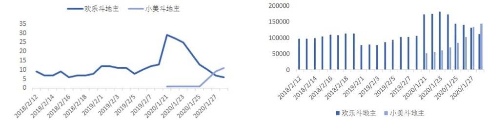 此外,手游也成为疫情期间线下娱乐活动的重要替代品。春节期间,《王者荣耀》的DAU峰值在1.2亿~1.5亿之间,除夕当天流水更是超20亿。而相对休闲的棋牌类游戏,春节前后排名和下载量增幅都十分亮眼。