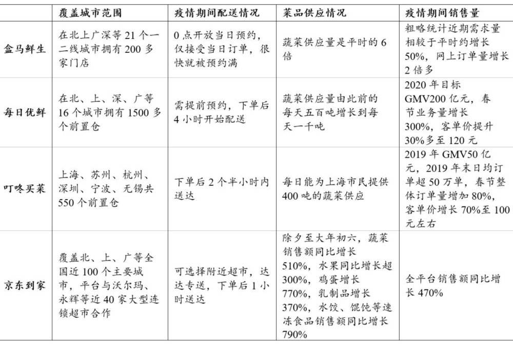 截至2020年2月6日,京东到家日活突破100万,盒马、叮咚买菜突破40万,且每日新增用户还在不断增加。