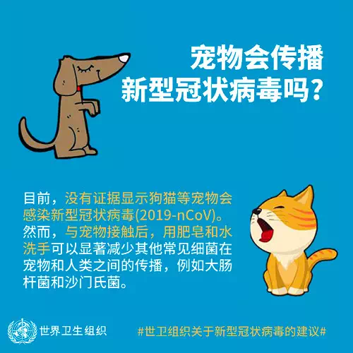 此前,世界卫生组织曾公开发布建议指出,目前没有证据显示猫狗等宠物会感染新冠病毒。不过,与宠物接触后用肥皂和水洗手可以显著减少其他常见细菌在宠物与人类直接等传播,例如大肠杆菌和沙门氏菌。