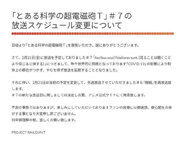 2月中旬,《恋爱小行星》《A3!》《某科学的超电磁炮T》《无限系统树》等日本番剧宣布延期播出或是改档,这是由于国内新冠肺炎疫情蔓延,国内动画公司被迫停工,部分由国内公司参与制作作画的日本番剧人手不足受到影响的原因。
