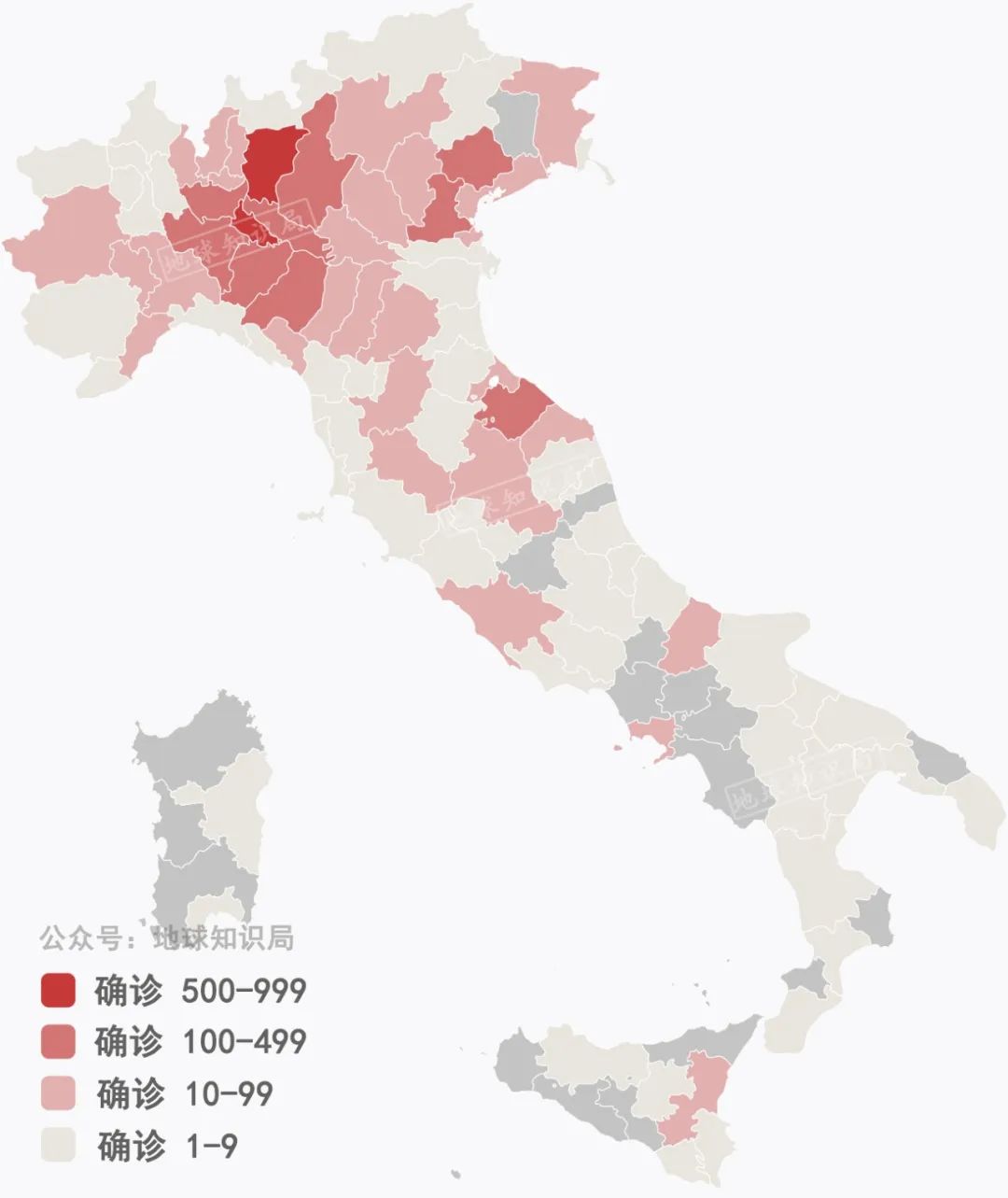 主要在北部,确诊数字还在快速增加。不过以意大利当前的防控程度,南部很难幸免,且从北意大利出发,整个西欧都很紧张...