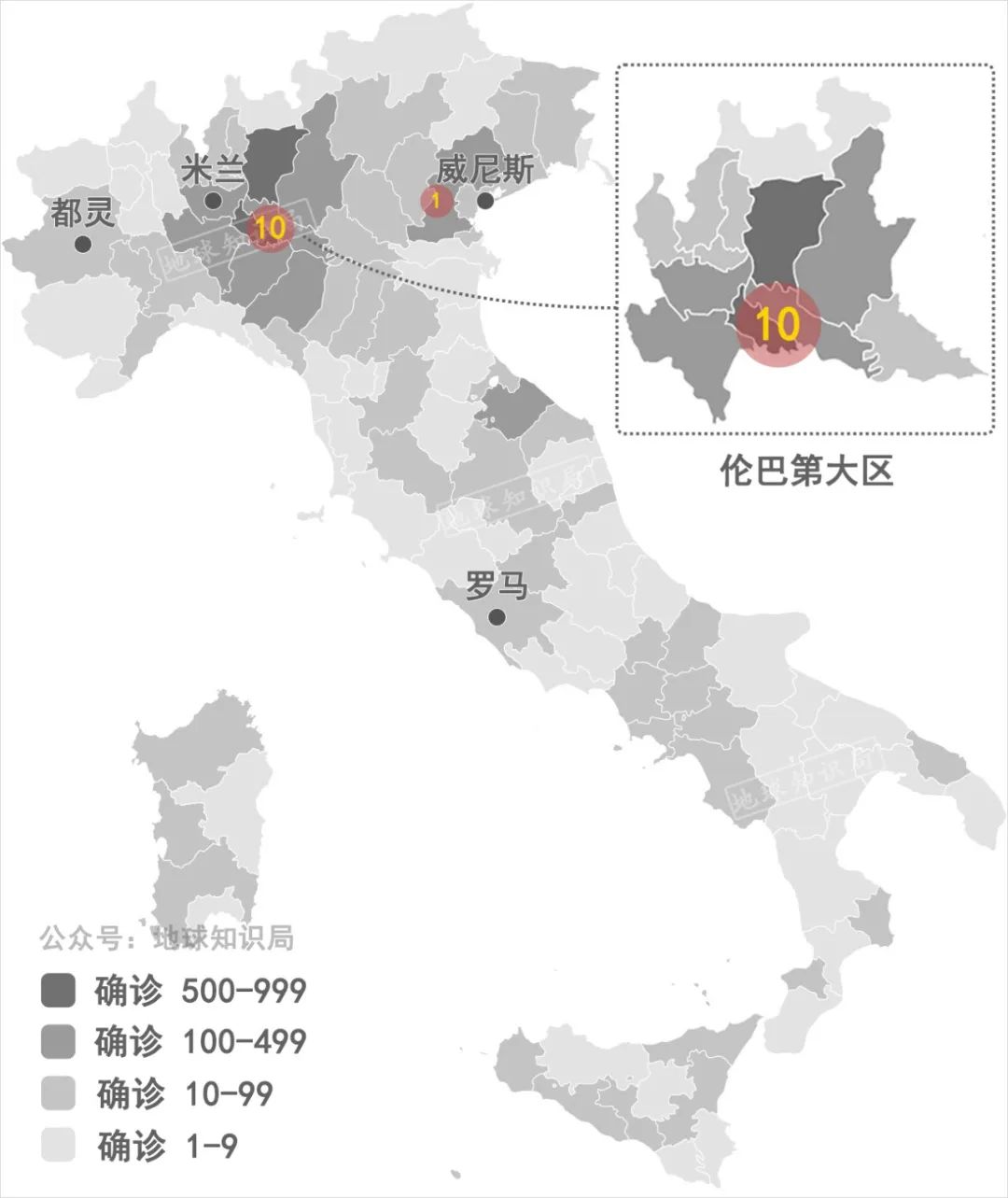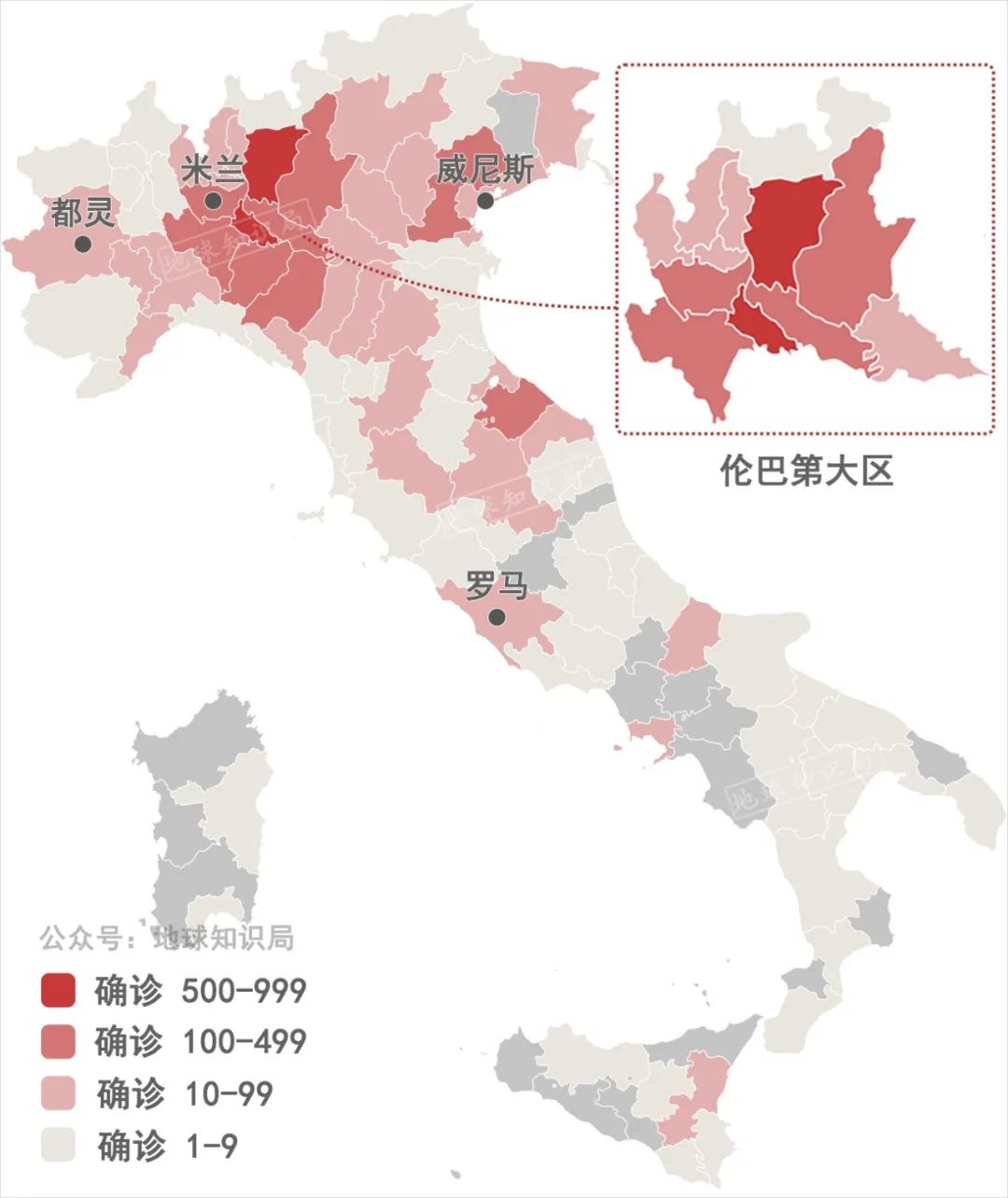 目前意大利新型冠状病毒确诊4680例,死亡179例,死者平均年龄81岁,治愈523例。确诊患者中,2613人都来自于伦巴第大区,与中国、韩国、伊朗相似,意大利的疫情中心也在交通发达,经济繁荣的地区,且疫情扩散主要源于本土而非输入。
