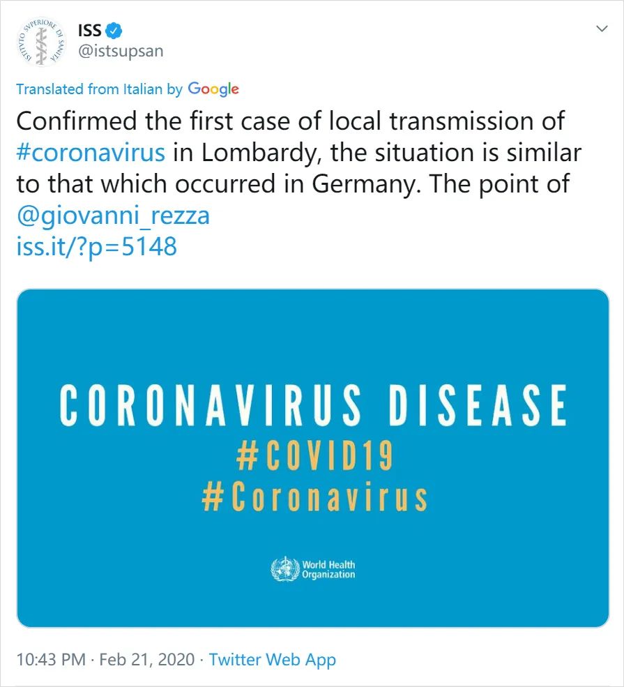 2月21日伦巴第地区出现意大利本土第一例确诊病人。这位38岁的男性出现呼吸问题后,医生判断他并未出现疑似身患新冠肺炎的特征,导致病毒传感了他怀孕的妻子、跑步的同伴和医护人员。