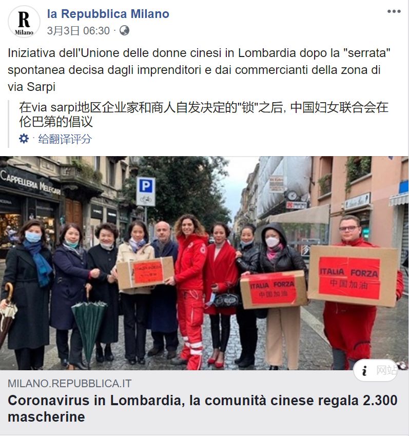 同时意大利的三十万中国侨民这次也给华人长脸了。3月2日,米兰华人群体向伦巴第的红十字会捐赠了2300个医用口罩,缓解当地口罩紧张的状况,得到了意大利主流媒体的报道,既为抗击疫情,也为抗击疫情发生以来的歧视做出了贡献。