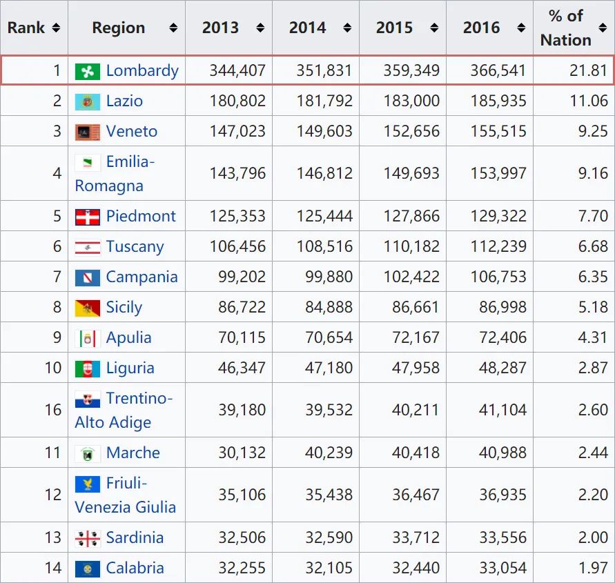 以米兰为首的伦巴第GDP占到全意大利五分之一强